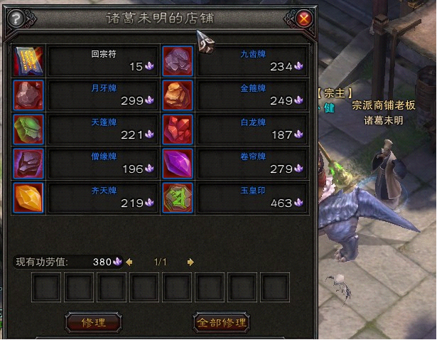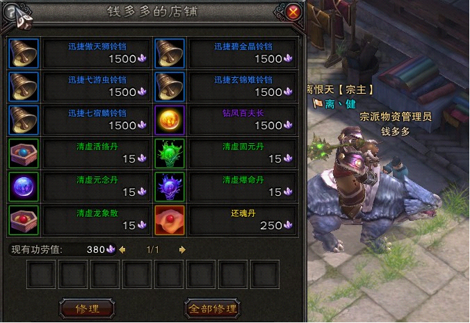 钱多多的店铺:功劳值可兑换坐骑、BUFF增益药品、还魂丹等。