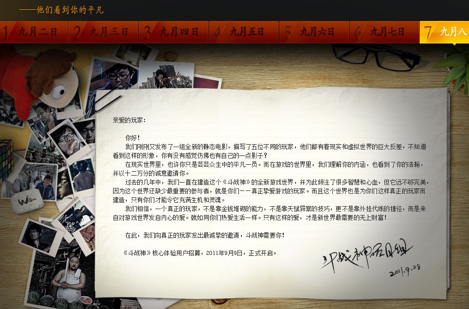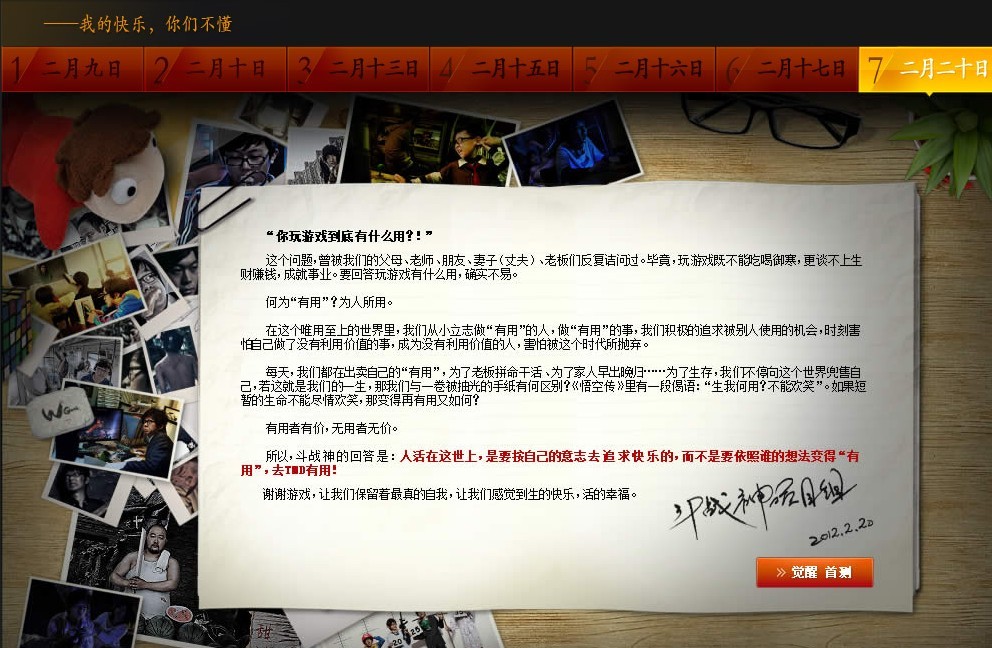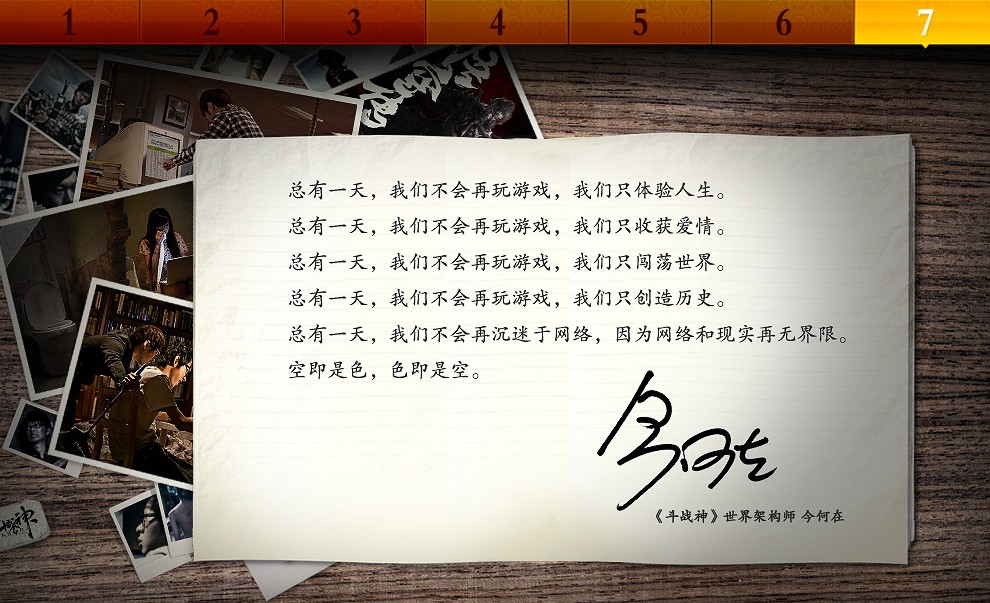 斗战神以80后玩家人生游戏经历为出发点,讲述我们这一代玩家所亲身经历过的内容,街机厅、上课玩游戏、CS、通宵游戏练级、上班时偷玩游戏。并且在第六日对过往的经典游戏致以最高的敬意。